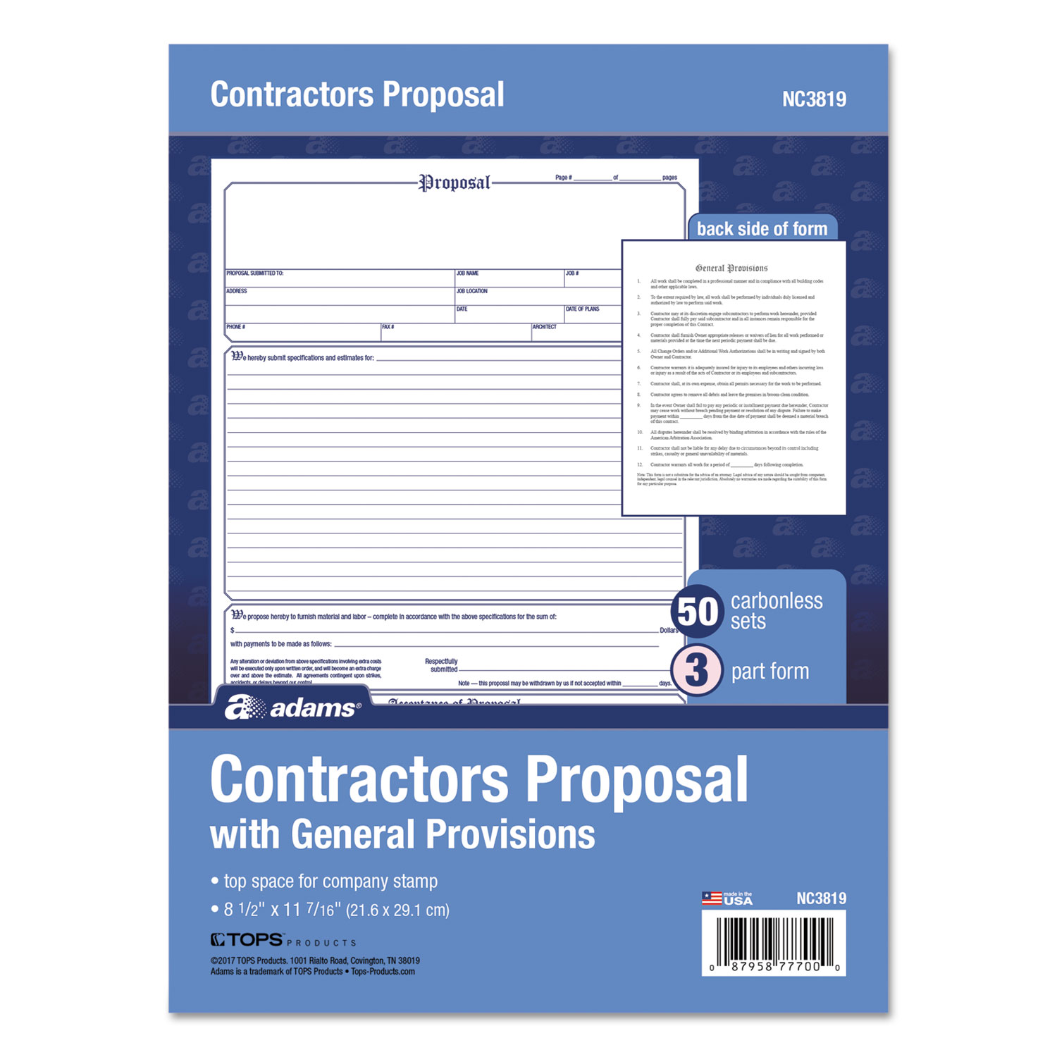 Contractors Proposal Forms include space for total cost and terms of payment. General contract provisions are printed on back. 3-part carbonless (white, canary, pink paper sequence).