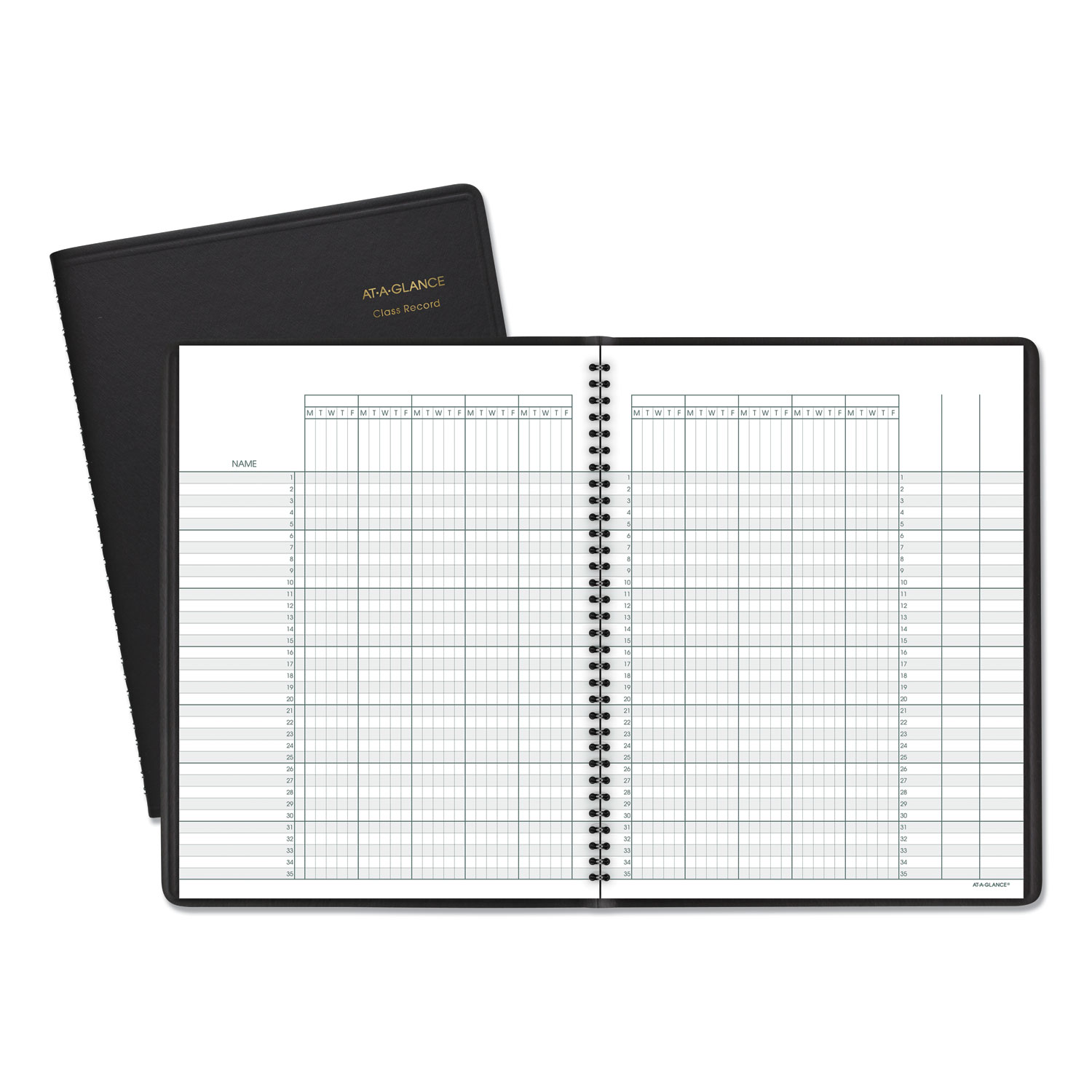 Space for up to 35 students per two-page spread. Provides for 10 weeks of tracking grades, attendance and more. Seating charts and notes pages. Undated with a box to write in start and end dates above each weekly section. Wirebound with black cover.