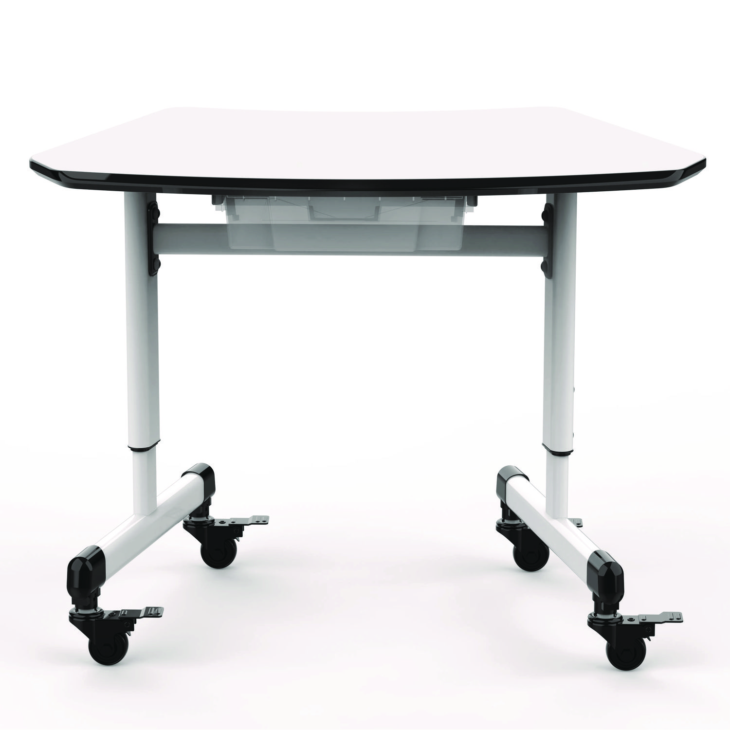Luxor's height-adjustable trapezoid classroom desk makes it easy for students to work individually or in pods of up to eight desks. Thanks to its space-saving design, it also makes an excellent student desk for remote learning. Highlights include dual backpack hooks, plus a clear, removable MBS bin that provides a roomy place to store papers, pencils, and other small items. Four 2" casters (each with a locking brake) make it effortless for students and teachers to move the desk where it is needed. The tough laminate top is scratch-resistant and easy to clean, plus it's edged with a tough and protective bumper molding to protect walls and furniture. This versatile student desk is perfectly sized for young learners and offers a height adjustment so it can fit kids of many ages. Series Name: Luxor MBS Classroom; Worksurface/Base Color: White; Color Family: White; Worksurface Shape: Trapezoid.