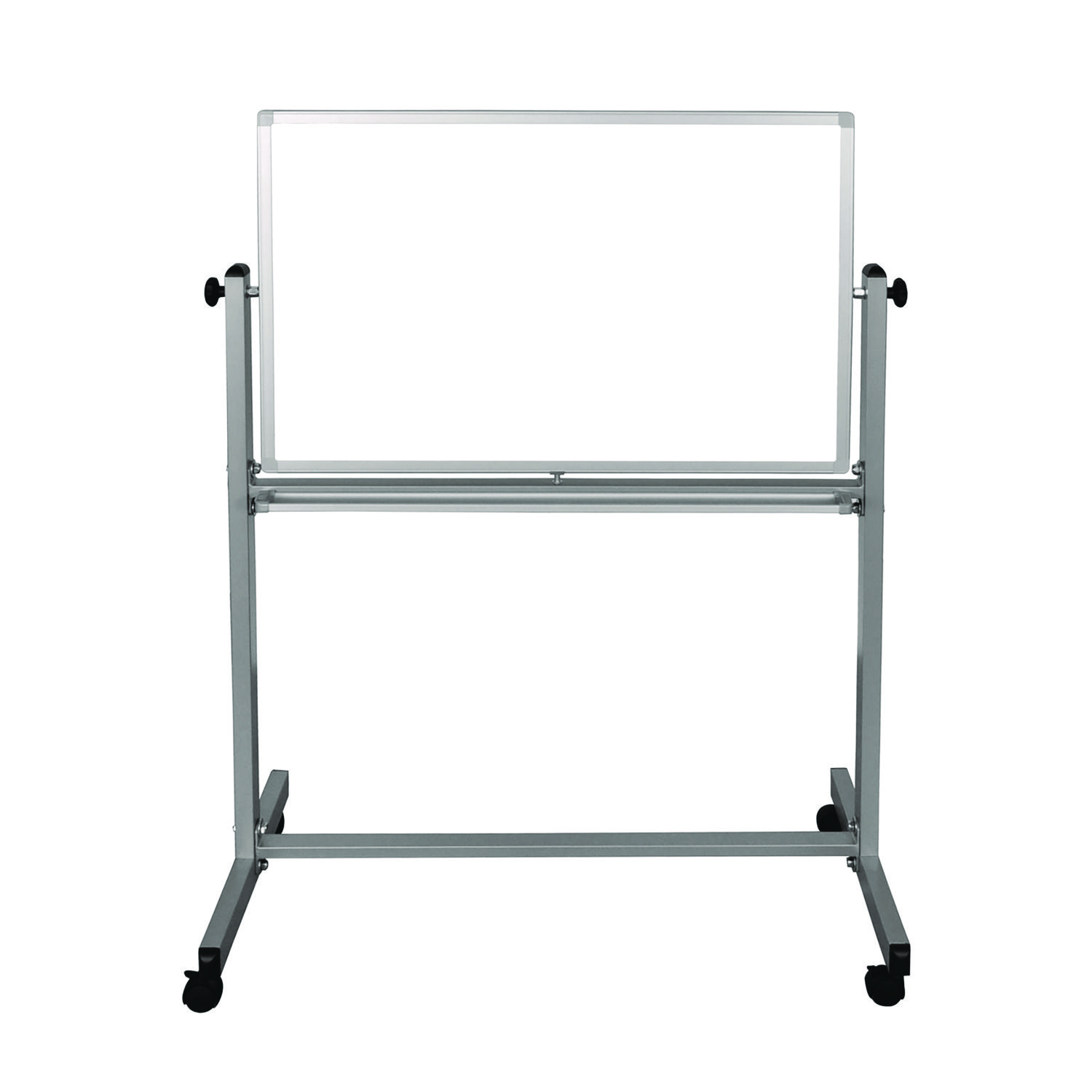 Built for brainstorming, teaching or organizing ideas and information, this Luxor mobile magnetic dry erase board doubles the writing space and delivers the durable mobility needed for dynamic workspaces. A slender-yet-sturdy frame provides a professional appearance and rolling casters make it easy move around a room. To flip the board, simply loosen the side knobs and disengage the spring-loaded locking clip. Need to display charts, papers or photos? Use the magnetic surface as a bulletin board. Look no further for a high-quality, affordable mobile marker board. Board Surface Type(s): Dry Erase; Magnetic Board Surface: Yes; Surface Use Rating: Heavy/Frequent Use; Surface Material: Painted Steel.