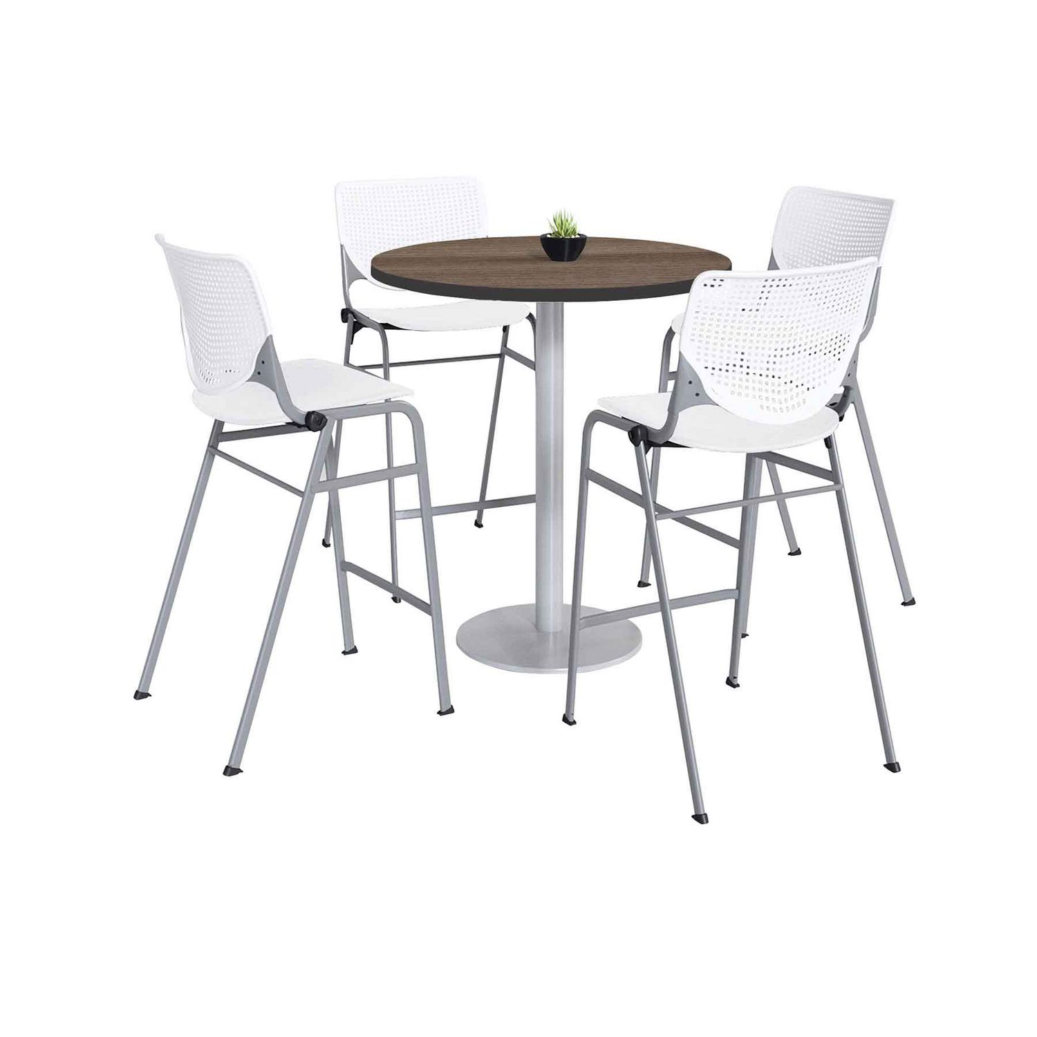 Contemporary and comfortable breakroom/cafeteria furniture. Table and 4 barstool set. This pedestal table has a 1.25" thick high-pressure laminate top that's durable and easy to clean. The top has an attractive edge that won't crack or peel. The solid cast iron round base has leveling glides to prevent the table from wobbling on uneven floors. The steel column has a 3" diameter and is made of 16-gauge steel. The top and base are all shipped in one box. Easy to assemble. The barstool has an easy to clean polypropylene seat and back. The ergonomic perforated back allows for enhanced circulation, while the radius conforms to your back for maximum comfort. The chair offers a contoured extra wide seat pan and a 400-lb weight capacity to provide comfort and accommodate all sizes. The oval frame is made of 15-gauge steel with silver powder-coat. The 2300 is one of most complete stack chairs on the market. It's just plain.... KOOL. Tables shipped unassembled. Chairs shipped assembled. Top Color: Studio Teak; Color Family: Teak; Base Color: Silver; Top Shape: Round.