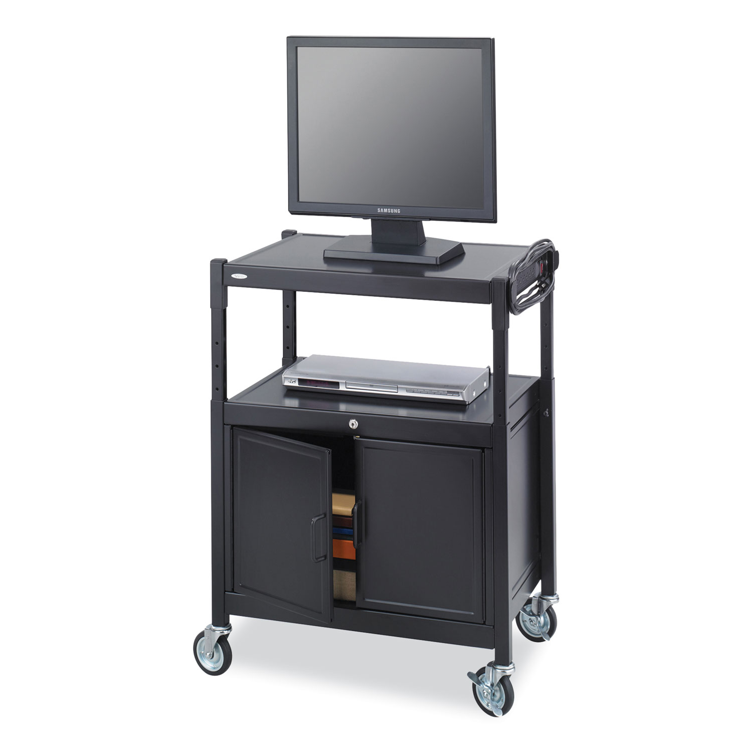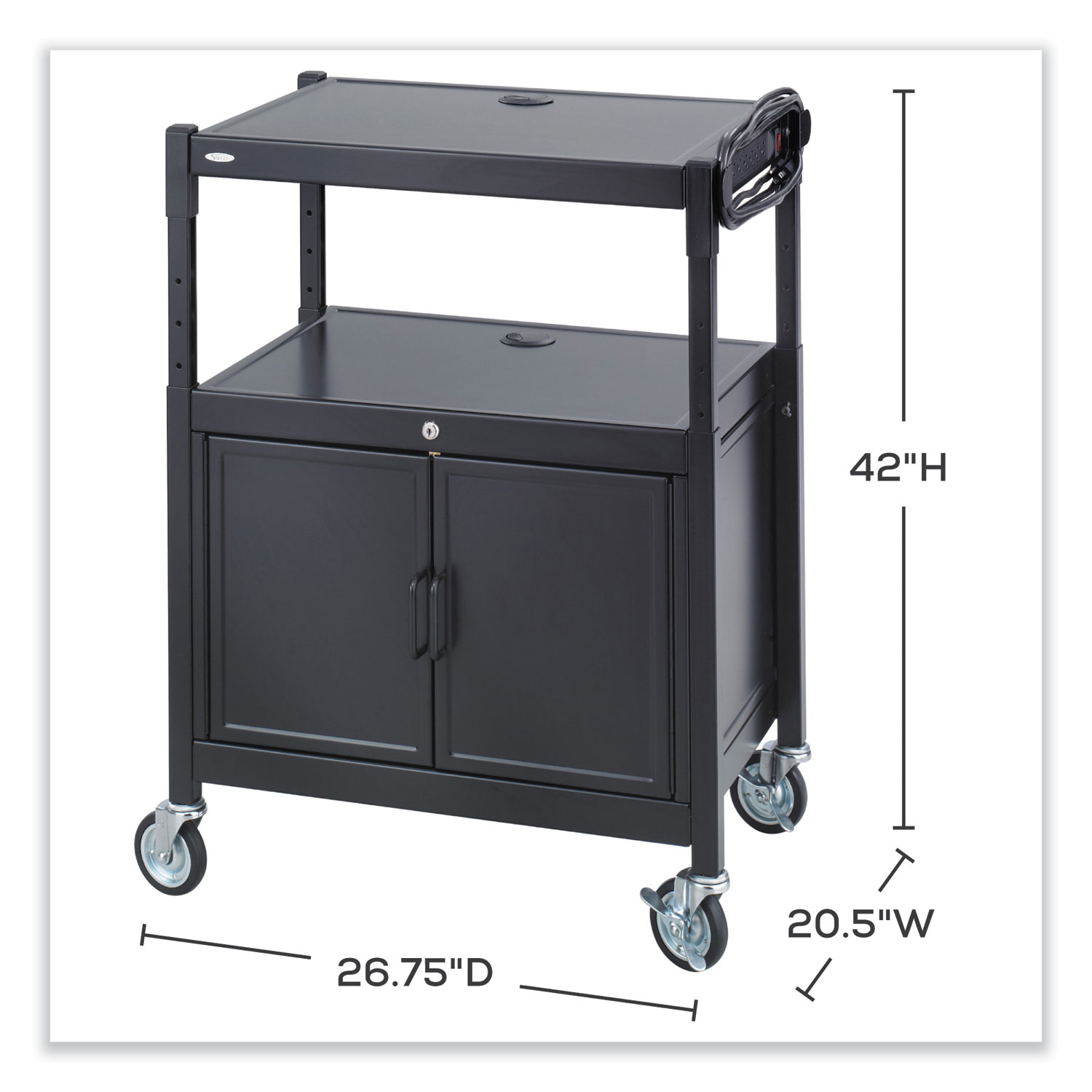 The Steel Adjustable AV Cart with Cabinet is a black projector cart that holds monitors up to 20". Furnished with a secure locking cabinet, the steel projector cart adjusts from 26" to 42" in 2" increments. Features a six outlet UL approved mini-surge protector with power switch. Mobile cart on four casters (two locking). Material(s): Steel; Overall Material Type: Metal; Color: Black; Color Family: Black.