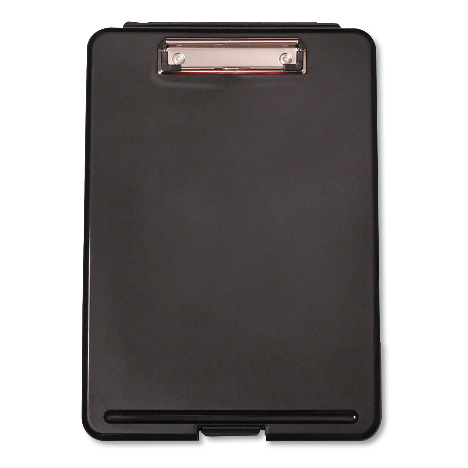 Portable storage box with clipboard for an easy on-the-go work surface. Ample interior space to hold important documents and forms. Low-profile metal clip with corner grips. Smooth writing surface. Snap closure. Plastic material is impact- and water-resistant.